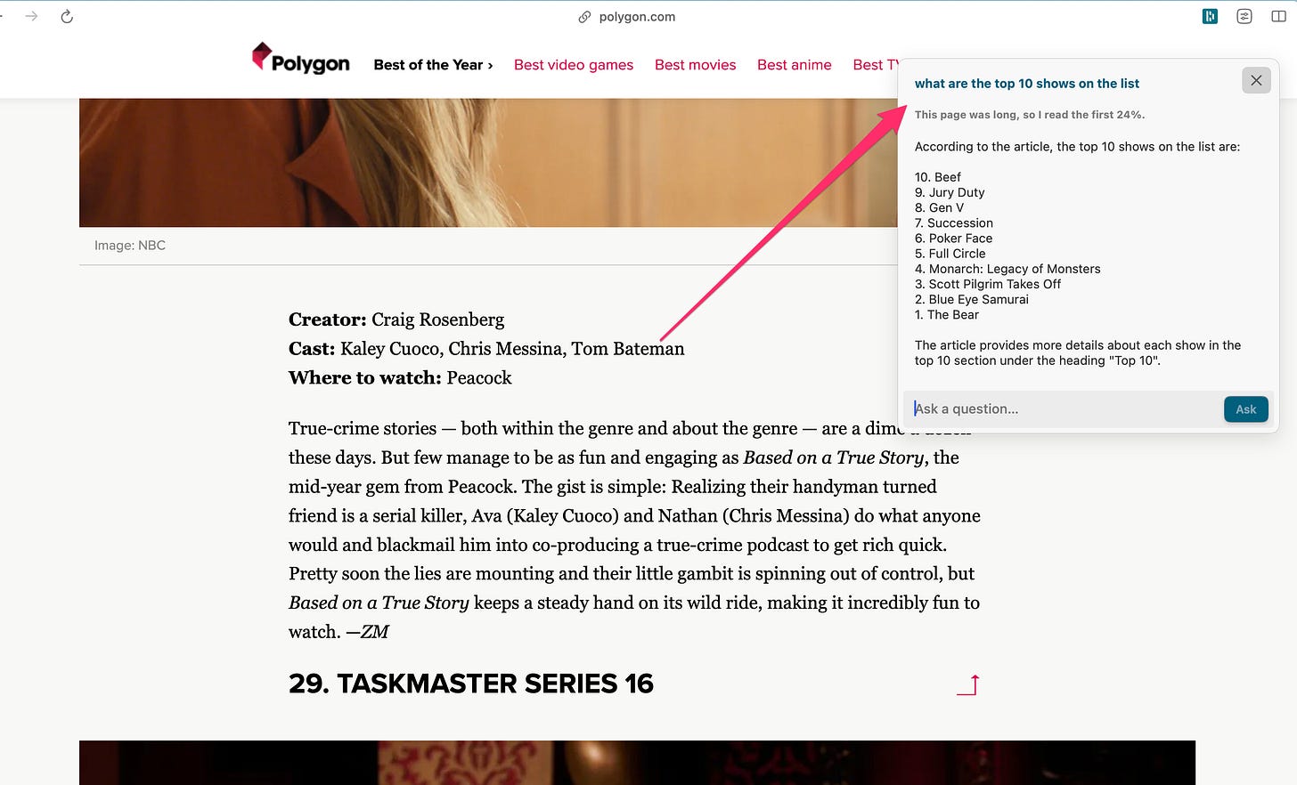 I continue to be impressed by Arc. Recently they added an enhanced “find” function that uses AI to answers questions about the page you’re browsing. The example below shows one of those “Top X” genre of pages — the kind that counts backward down a list and has gigantic ads between each one. This one is top 30 TV shows.